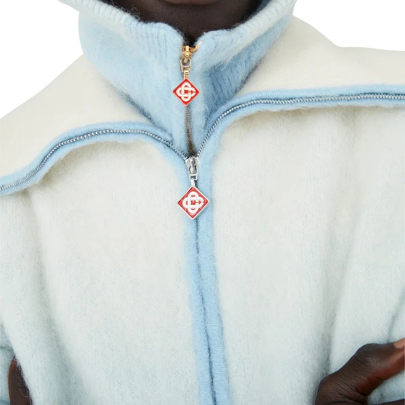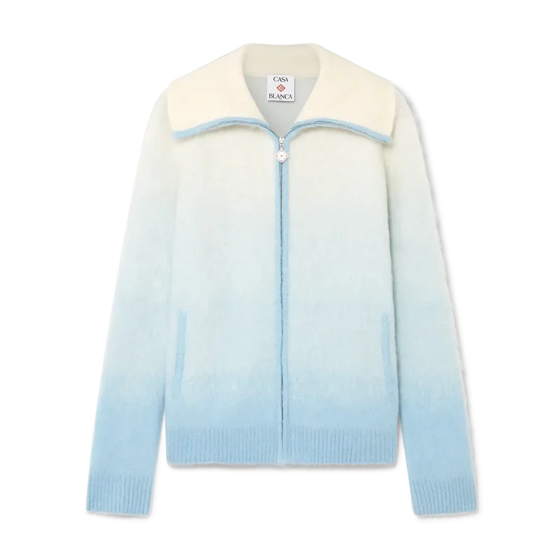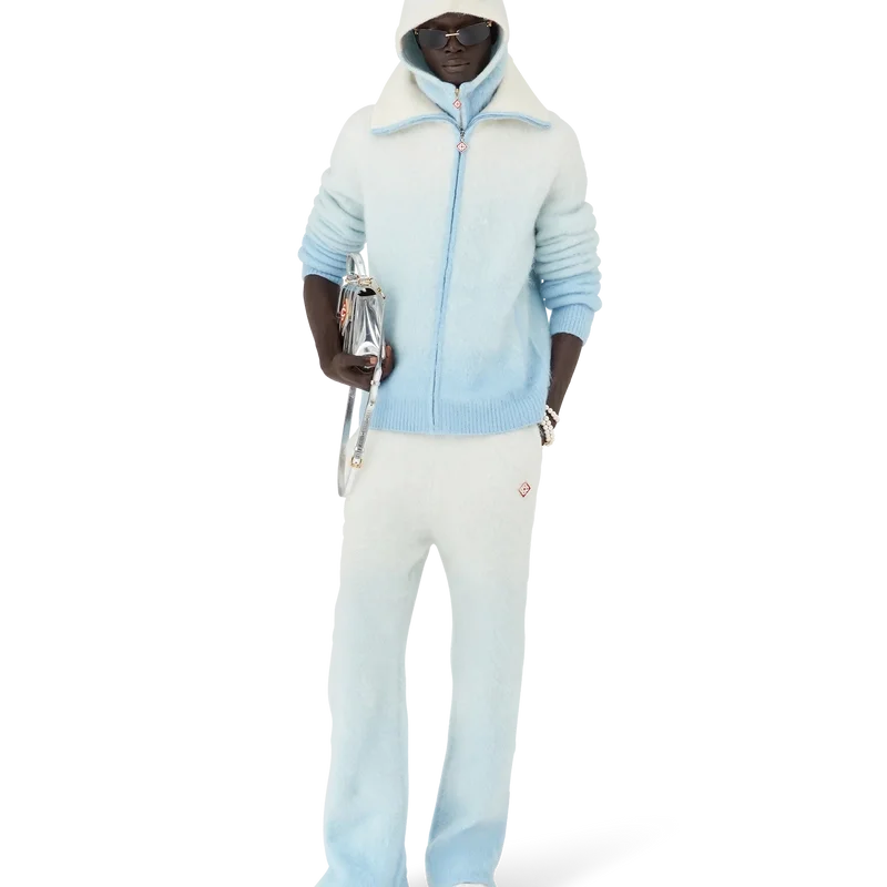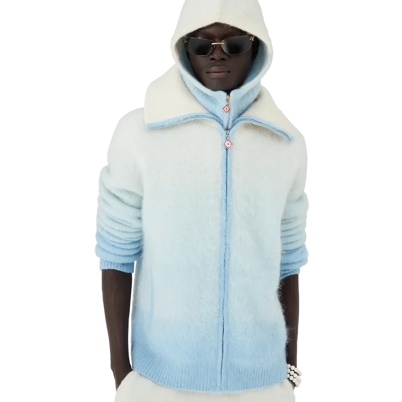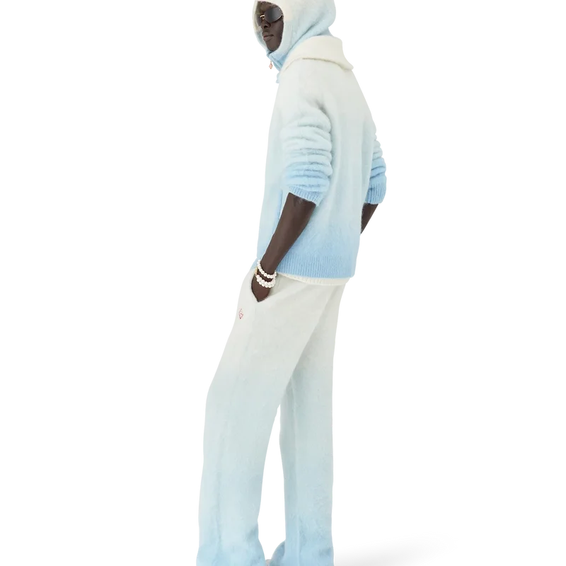 Der Ski Jumper ist ein raffiniertes Apras-Sport-Design aus einem Mohair-Mischgewebe mit einem blau-weißen Farbverlauf, inspiriert vom Abendrot über Japans schneebedeckter Landschaft. Er erinnert an den Übergang, wenn das schwindende Tageslicht auf den frischen Schneefall in den ländlichen Bergtälern trifft und gefrorene Bäche sich durch Hokkaidos Ackerland schlängeln.