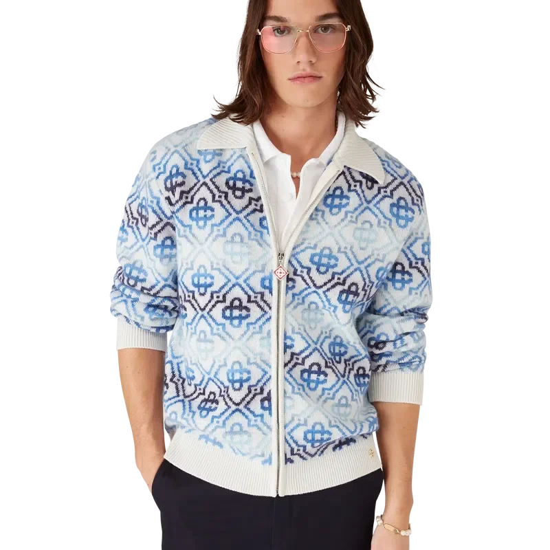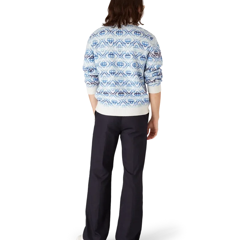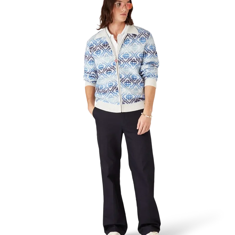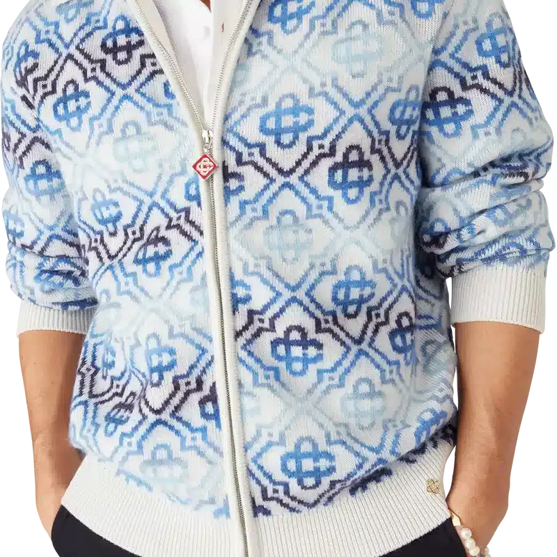 Der Space Dye Monogram Langarm-Cardigan aus Merinowolle ist ein raffiniertes Strickdesign mit dem charakteristischen Monogramm des Hauses in einem blauen Farbverlauf, gefertigt aus Space-Dye-Garnen, die Tiefe und Dimension erzeugen. Abgerundet durch einen Reißverschluss mit dem charakteristischen Diamond Monogram-Reißverschlusszug des Hauses sowie gerippten Details an Kragen, Ärmelbündchen und Saum.