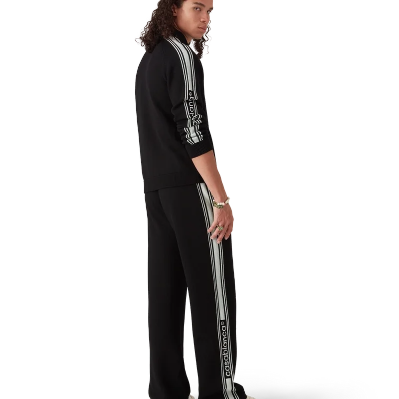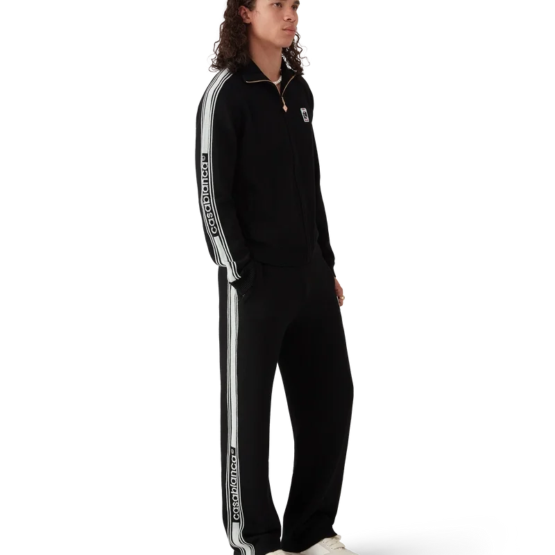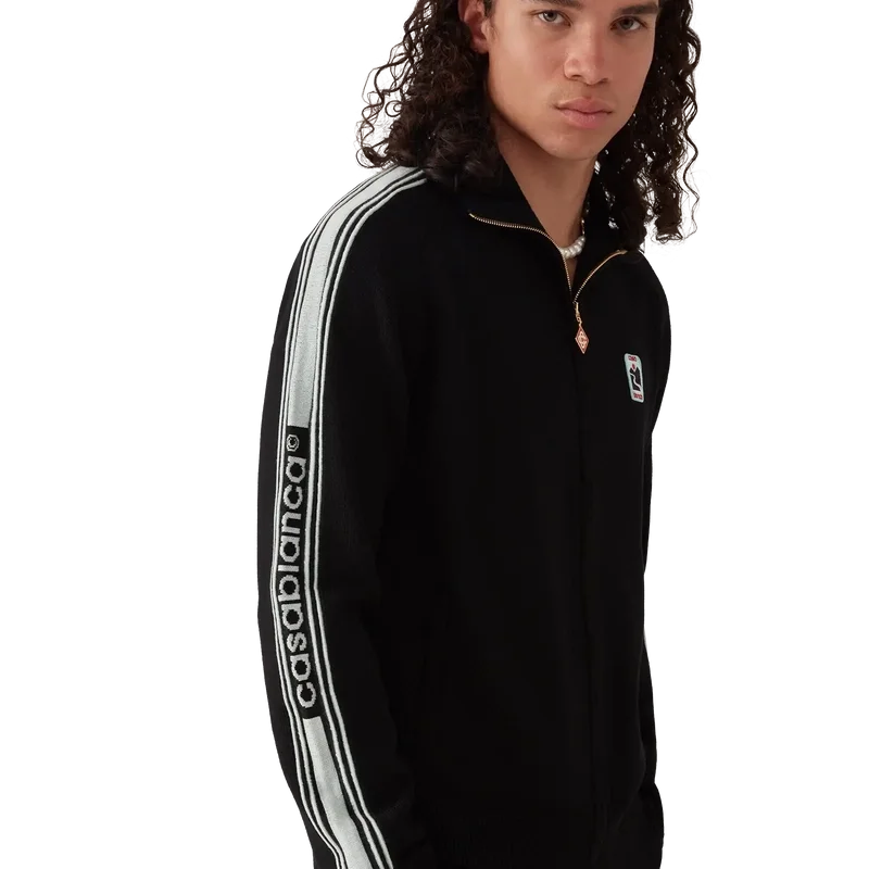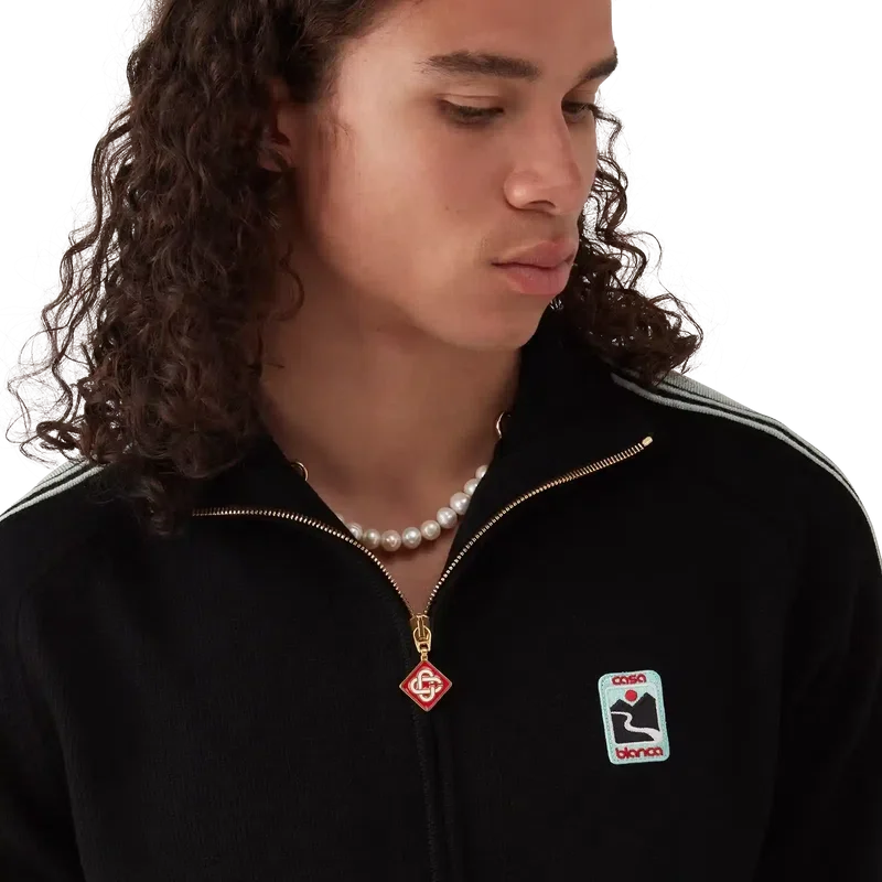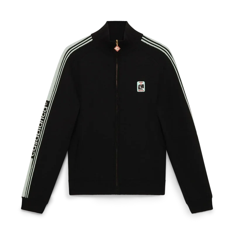 Die Merino-Strick-Trainingsjacke ist ein langärmeliges Modell aus Merinowolle. Mit Reißverschluss, kontrastierender Knopfleiste, Rollkragen, Streifen an den Ärmeln, gerippten Bündchen und Saum sowie einem Casablanca-Logo.
