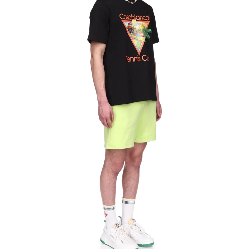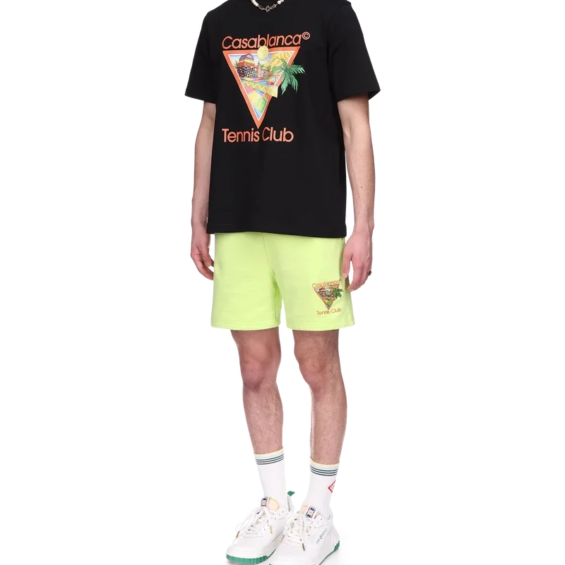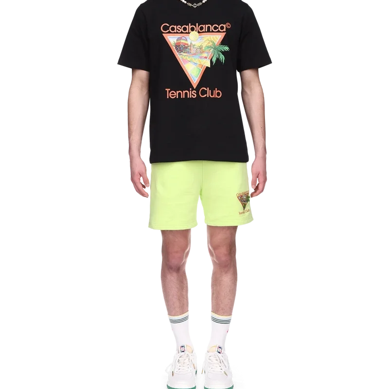 Das Afro-Cubism-Tennis-Club-T-Shirt ist ein bedrucktes Design, das von der Wärme der traditionellen Architektur Nigerias inspiriert ist; die Schönheit der traditionellen und organischen Kunst wird als Landschaft dargestellt, wobei unser traditionelles Layout beibehalten wird – die Palme, die Perspektive des Gebäudes und ein Tennisplatz. Hergestellt aus Bio-Baumwolle, mit klassischem Rundhalsausschnitt.