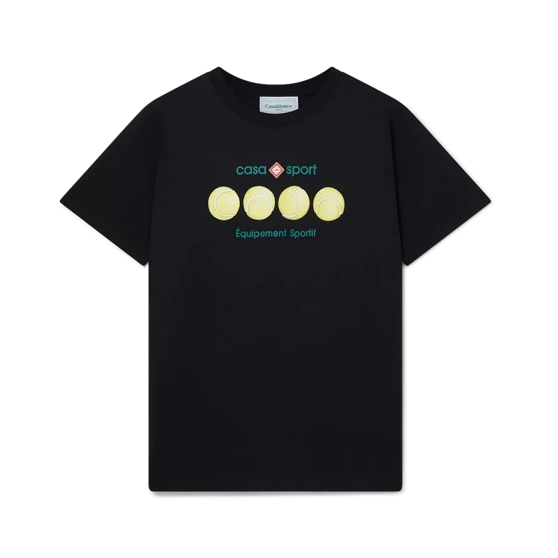 Das Casa Sport Tennis Balls T-Shirt aus Bio-Baumwolle mit Siebdruck zeigt ein saisonales Motiv, das die charakteristische Tennis- und Casa Sport-Ikonografie des Hauses aufgreift. Mit klassischem Rundhalsausschnitt, kurzen Ärmeln und Casablanca Paris-Markenlabel, entworfen für eine lockere Passform.