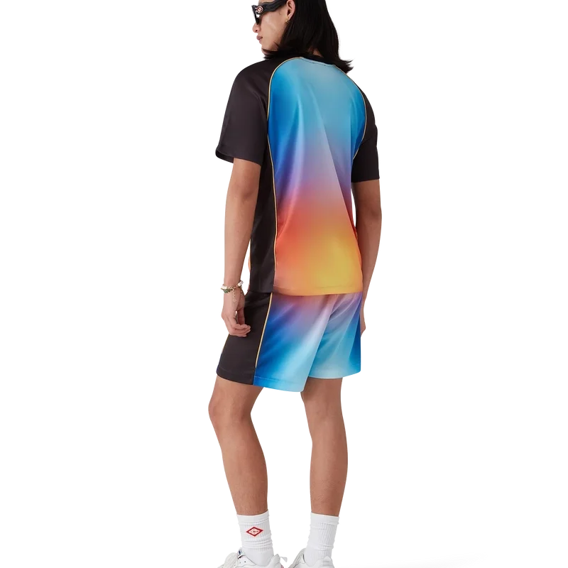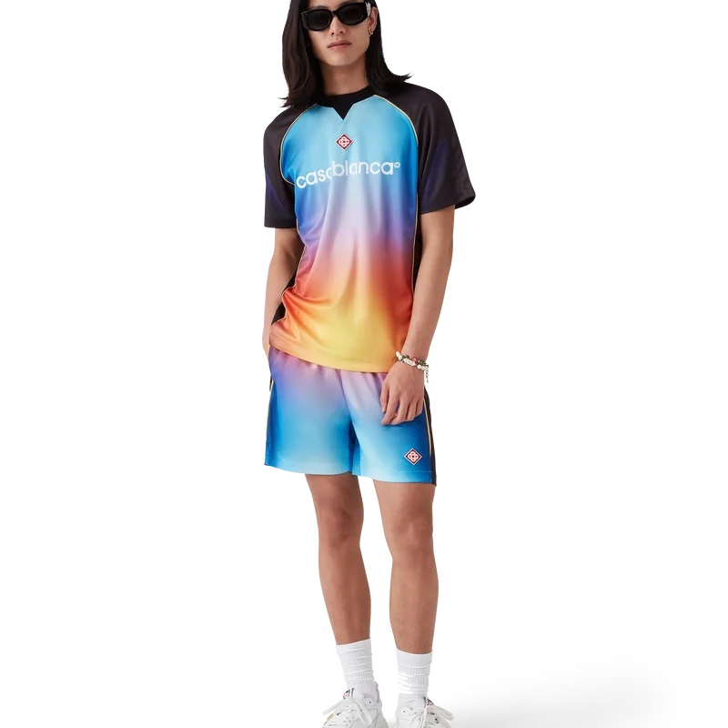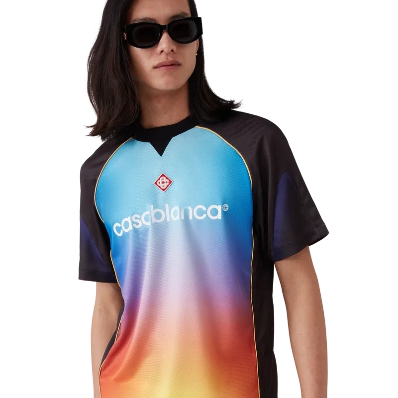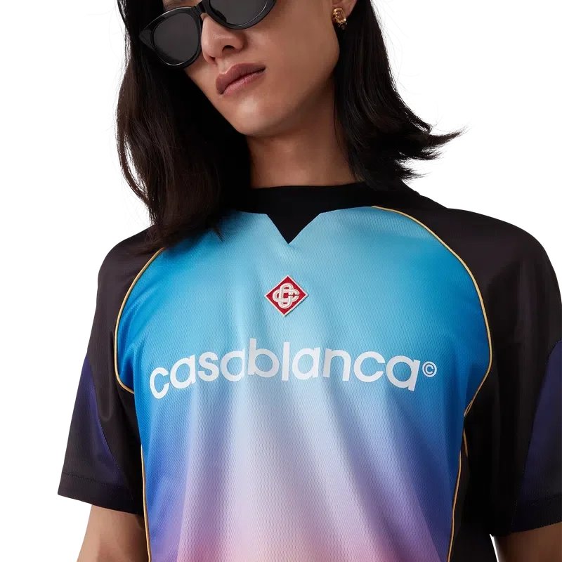 Das Gradient Football Shirt ist ein kurzärmeliges Sporthemd aus bedrucktem Birdseye-Mesh-Stoff mit einer Reihe lebhafter Farben, die eine futuristische Interpretation des Casablanca-Farbverlaufs darstellen – eine Halo-Form, inspiriert von Vintage-Sci-Fi-Postern und Schallplatten. Abgerundet wird das Design durch den charakteristischen Diamant-Logo-Aufnäher des Hauses und das Casablanca-Logo auf der Brust sowie einen klassischen Rundhalsausschnitt.
