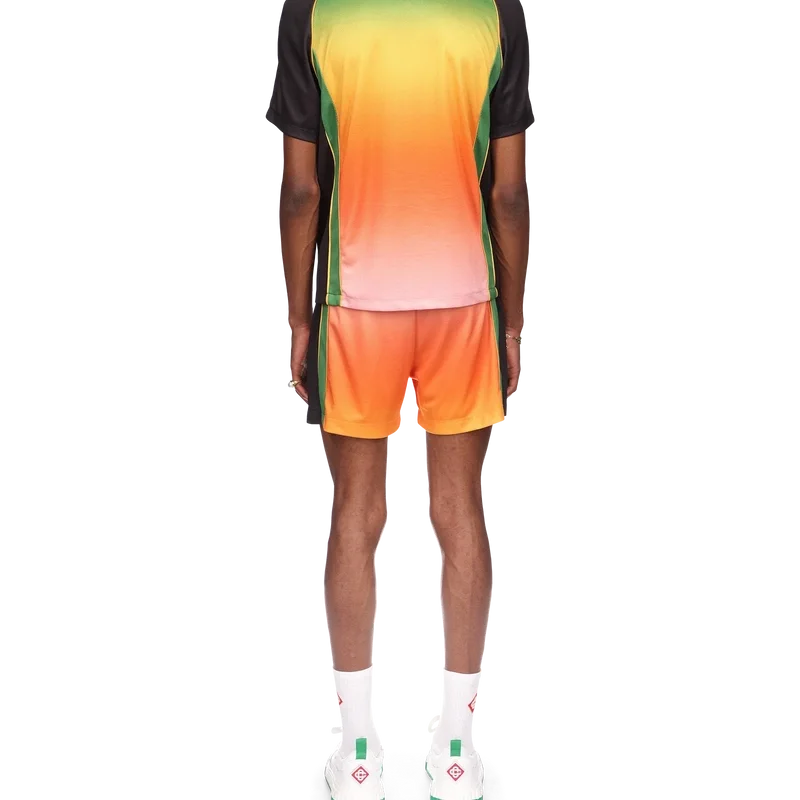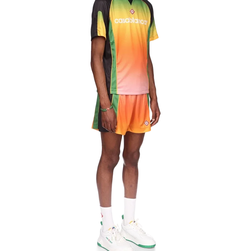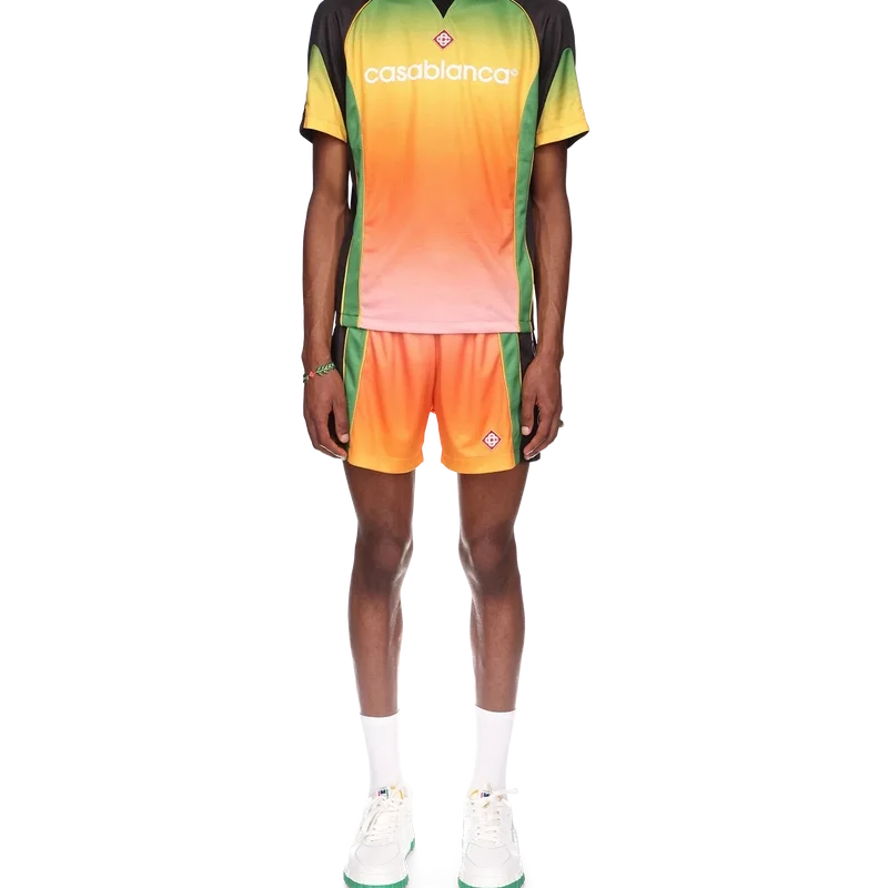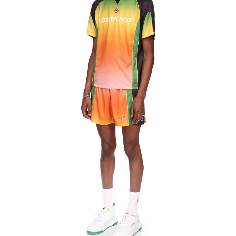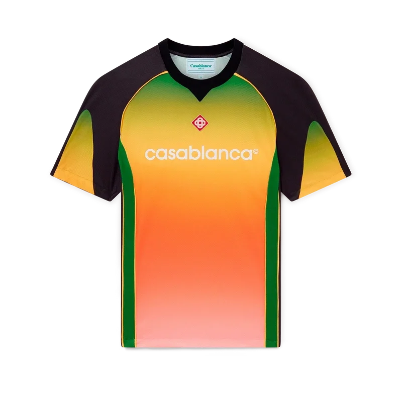 Das Gradient-Fußballhemd ist ein kurzärmeliges Sporthemd mit einem Farbverlauf, der den reichen Austausch zwischen verschiedenen kulturellen Disziplinen in der afrikanischen Kunst, Musik und Film symbolisiert. Hergestellt aus Birdseye-Mesh und veredelt mit dem charakteristischen Diamant-Logo-Aufnäher des Hauses sowie dem Casablanca-Logo auf der Brust und einem klassischen Rundhalsausschnitt.