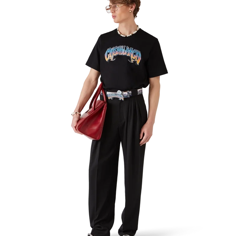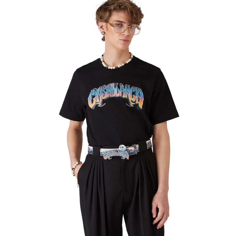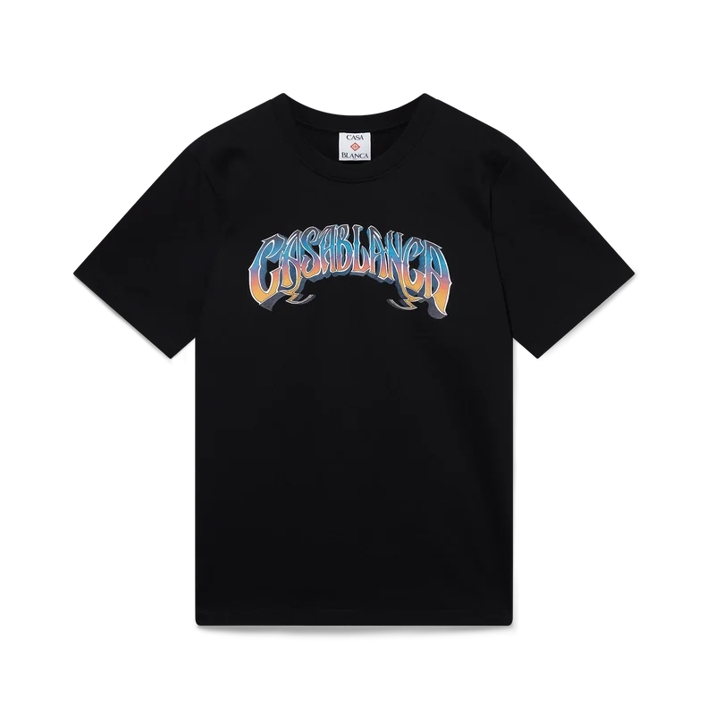 Das Gradient Gothic T-Shirt ist ein kurzärmeliges, bedrucktes Modell aus Bio-Baumwolle mit handgezeichneter Typografie des Casablanca-Logos im Farbverlauf der Saison, inspiriert von der in Tattoos verwendeten Gothic-Schriftart. Mit klassischem Rundhalsausschnitt.