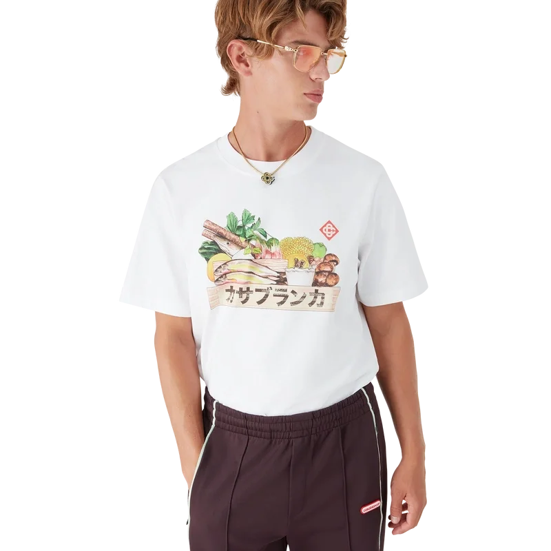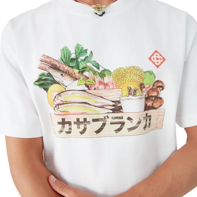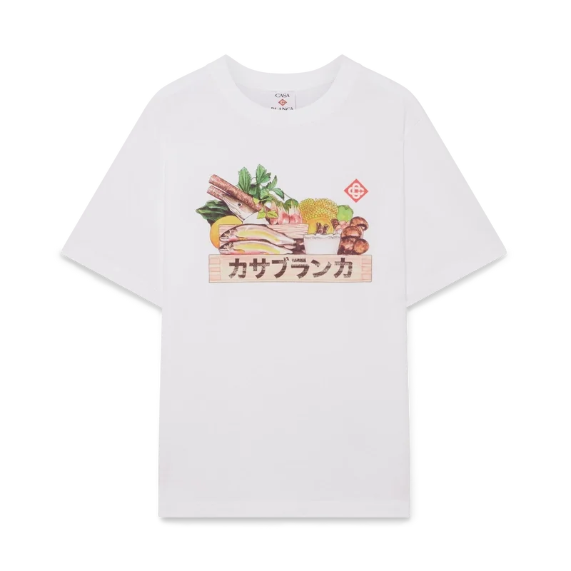 Das „Ingredients“-T-Shirt ist ein bedrucktes Kurzarm-Modell mit saisonalen Motiven, die die Bedeutung von Lebensmitteln in Japan und die Wertschätzung natürlicher Zutaten in ihrer ursprünglichen Form widerspiegeln. Es ist aus Bio-Baumwolle gefertigt und verfügt über einen klassischen Rundhalsausschnitt.