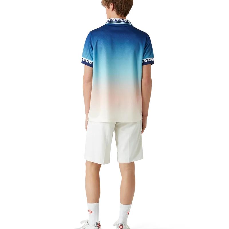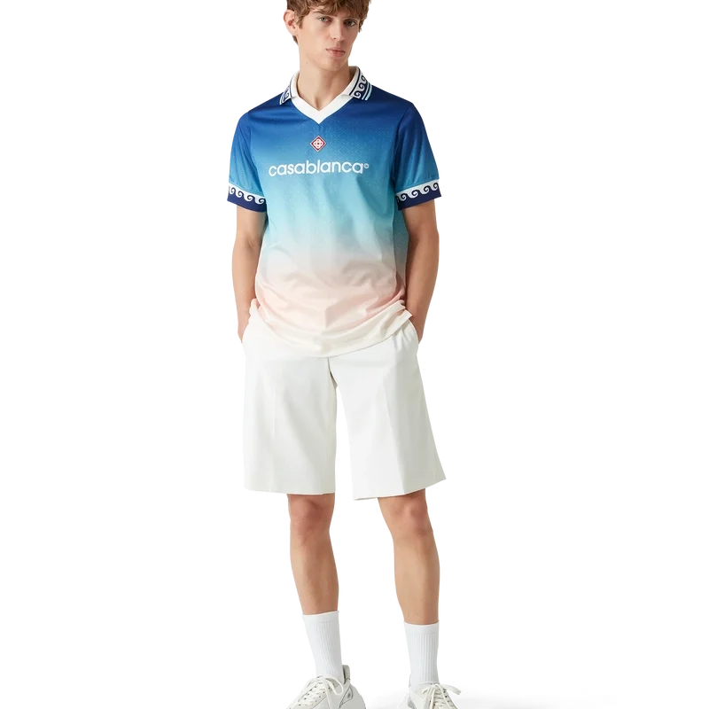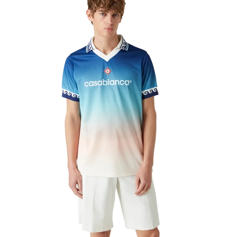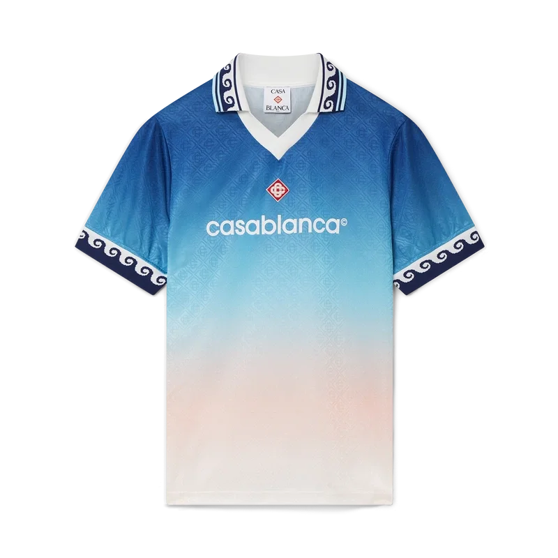 Das Jacquard-Monogramm-Fußballhemd ist ein kurzärmeliges Sporthemd mit dem charakteristischen Diamond Monogram des Hauses. Hergestellt aus einem Jacquard-Monogramm-Stoff mit Farbverlauf und veredelt mit dem charakteristischen Diamond Monogram-Logo-Patch des Hauses, einem kontrastierenden Rippkragen und einem Casablanca-Logo auf der Brust.