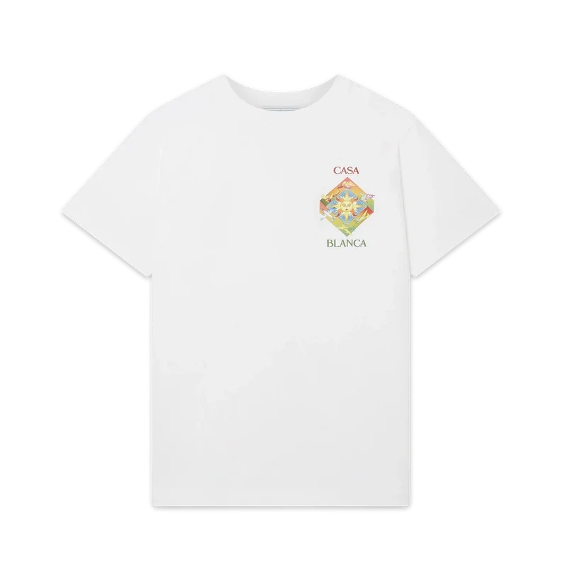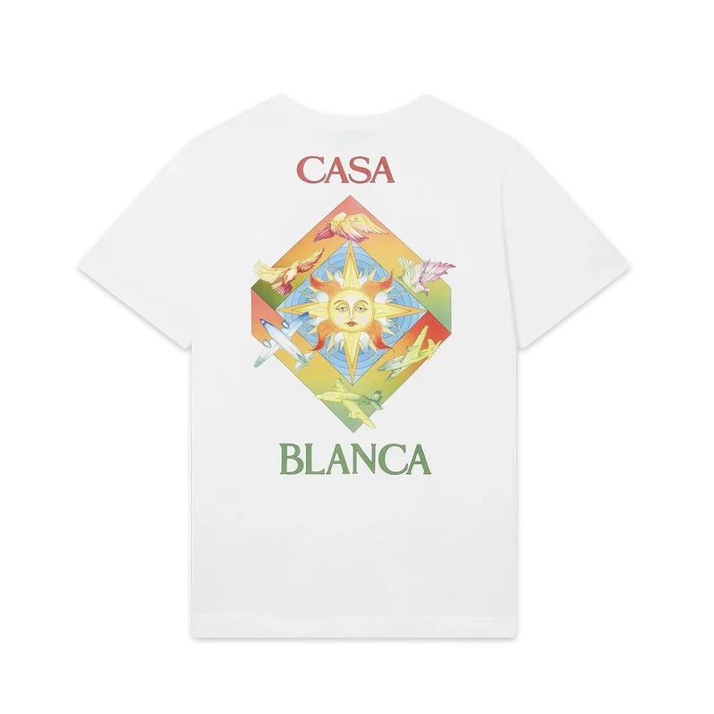 Das Les Elements T-Shirt aus Bio-Baumwolle mit Siebdruck zeigt ein saisonales Design, das Casablanca-Symbole und arabische Ikonografie mit Friedenstauben vereint. Mit klassischem Rundhalsausschnitt, kurzen Ärmeln und Casablanca Paris-Markenlabel, entworfen für eine lockere Passform.