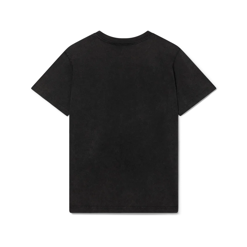 Das „Music for the People“-T-Shirt ist ein bedrucktes Kurzarm-Modell aus verblasstem schwarzem Bio-Baumwollstoff mit dem saisonalen Artwork des Hauses. Mit klassischem Rundhalsausschnitt und einem Casablanca-Markenlabel.