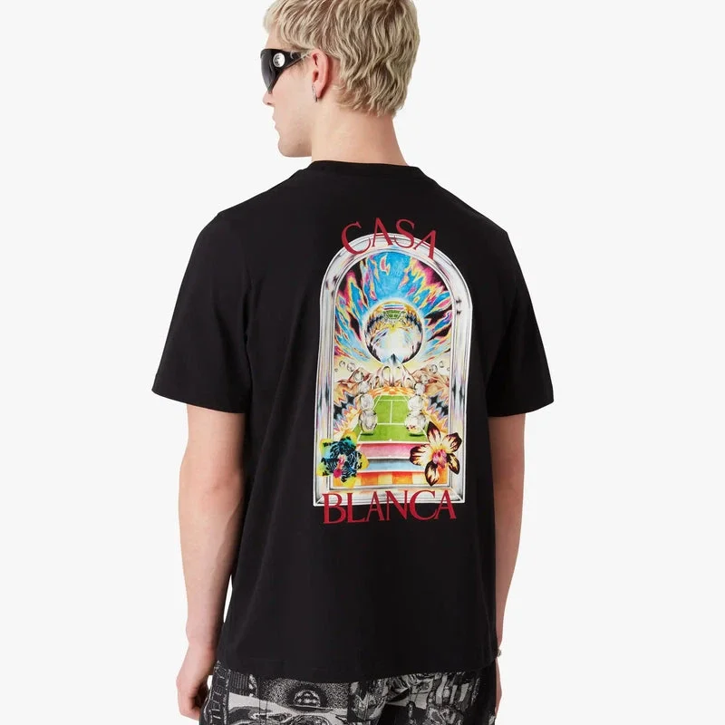 Das schwarze Tennis Landscape Kurzarm-T-Shirt mit Shorts besticht durch ein raffiniertes Design mit einem Motiv, bei dem miteinander verbundene Rahmen Nischen mit verschiedenen Szenen bilden, die durch den Fokus auf den Sport die Transzendenz von Zeit und Ort beschreiben. Abgerundet durch einen klassischen Rundhalsausschnitt.