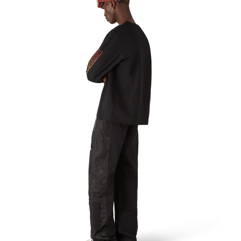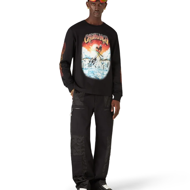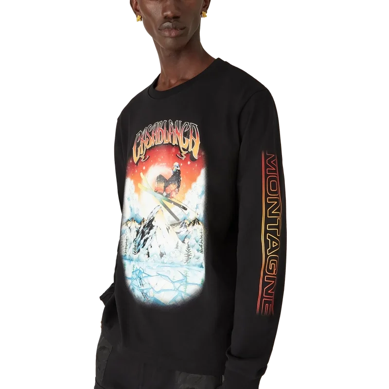 Das Ski-Langarm-T-Shirt ist ein raffiniertes Apras-Sport-Design aus schwarzem Bio-Baumwolljersey, inspiriert von der natürlichen Schönheit der Natur in Form der leuchtenden untergehenden Sonne über den zerklüfteten Umrissen der Berggipfel. Der feurig-rote Farbverlauf am Himmel unterstreicht die dramatische Intensität der alpinen Landschaft. Mit dem „Montagne“-Print auf den Ärmeln in einem explosiven orangefarbenen Farbverlauf.