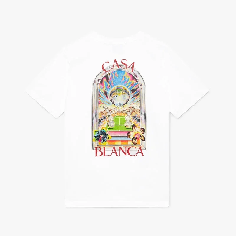 Das weiße Tennis-Landschafts-T-Shirt mit kurzen Ärmeln besticht durch ein raffiniertes Design mit einem Motiv, bei dem miteinander verbundene Rahmen Nischen mit verschiedenen Szenen bilden, die durch den Fokus auf den Sport die Transzendenz von Zeit und Ort beschreiben. Abgerundet wird das Design durch einen klassischen Rundhalsausschnitt und eine lockere Silhouette.