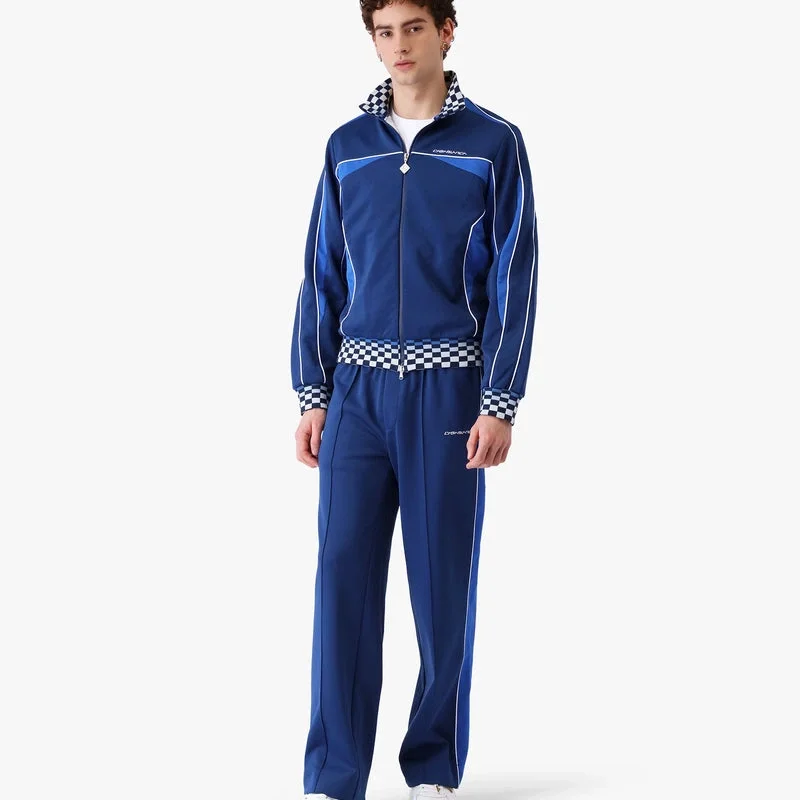 Die Navy Cyber Tricot Trainingsjacke besticht durch ein raffiniertes Design, das den gehobenen Ansatz des Hauses in Sachen Sportbekleidung verkörpert. Ausgestattet mit einem gestrickten Stehkragen, einem Reißverschluss, Paspeldetails an den Schultern und entlang der Ärmel, einem Futter, Seitentaschen, dem Casablanca-Logo des Hauses sowie einem Farbverlauf in Karomuster an Kragen, Ärmelbündchen und Saum.